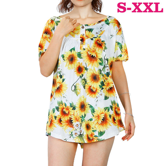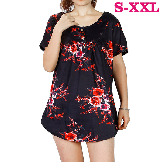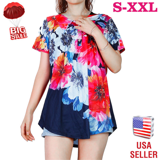 Women Summer Shirts Tops Loose Short Sleeve T Shirts Casual Floral Printed Button Shirts Blouse S-XXL