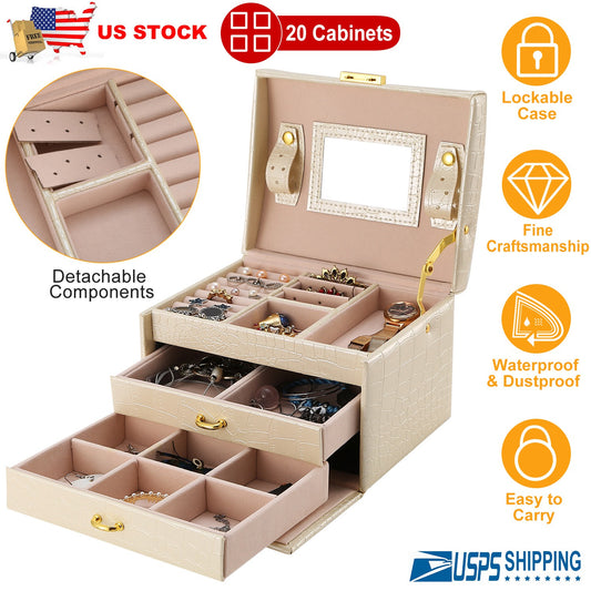 Jewelry Case Organizer 3-layer Lockable Travel Jewelry Box PU Leather Storage Display Case with Mirror Protective for Bracelets Earrings Rings Necklac