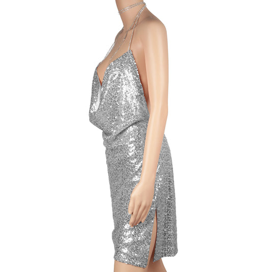 Sexy Women Chain Choker Side Slit Backless Slip Dress With Sequins