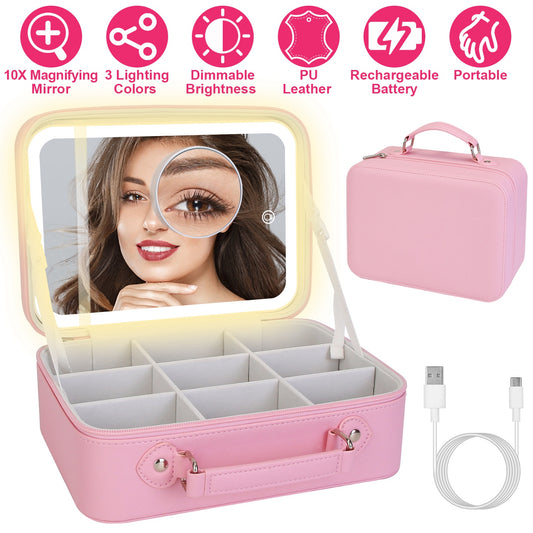 Travel Makeup Bag With 3 Light Colors Dimmable Brightness LED Mirror Detachable 10X Magnifying Mirror Adjustable Dividers Portable Waterproof Cosmetic