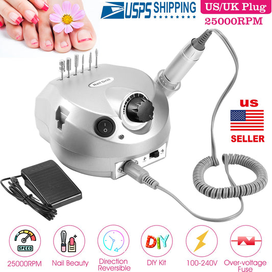 Acrylic Nail Drill Machine 25000RPM Electric Handpiece Glazing w/6 Bits Cuticle Grinder Manicure Pedicure Polishing File Kit for Nail Art