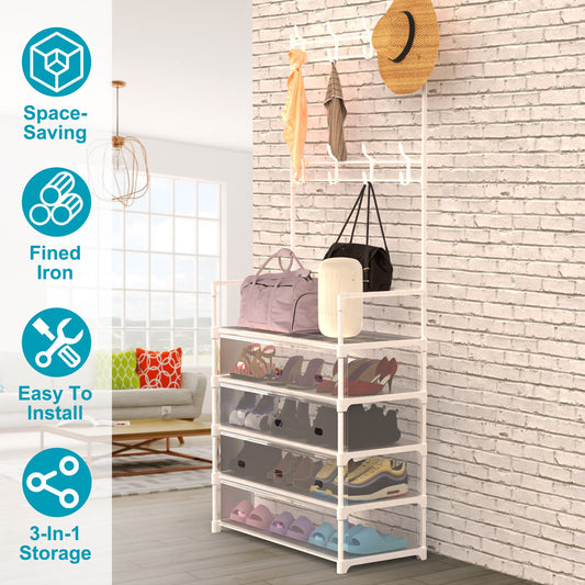 5-Tier Dustproof Entryway Hall Tree Coat Rack Shoe Rack With 8 Removable Hooks Freestanding Shoe Storage Shelf Hat Clothes Organizer For Front Door Be