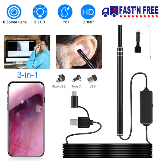 Ear Endoscope Otoscope Visual Earpick Ear Cleaning Camera Ear Wax Removal Tool IP67 Waterproof 3 in 1 Borescope w/ 6 Adjustable LED for Android
