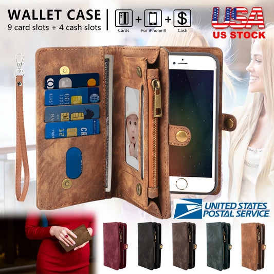 Phone Wallet Case For iPhone 8 Portable Wallet Case 2 in 1 Leather Zipper Magnetic Detachable 13 Card Slots Money Pocket Clutch Cover W/ID Widows