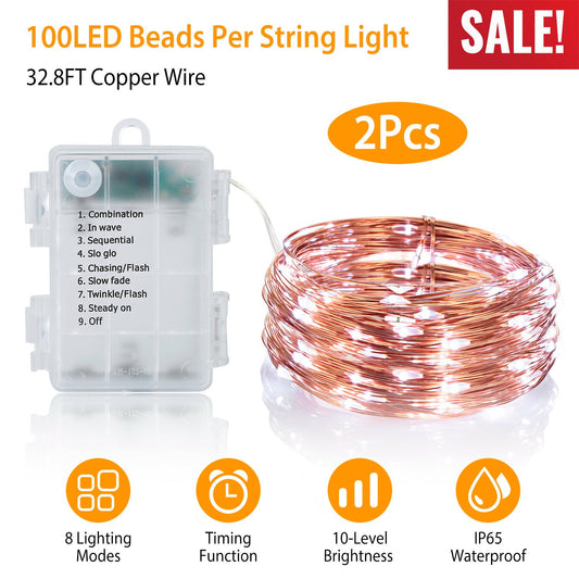2Pcs LED String Lights 100LED Beads 32.8FT Copper Fairy Lights IP65 Waterproof Battery Operated Flash Lights with Remote Control For Wedding Party Jar