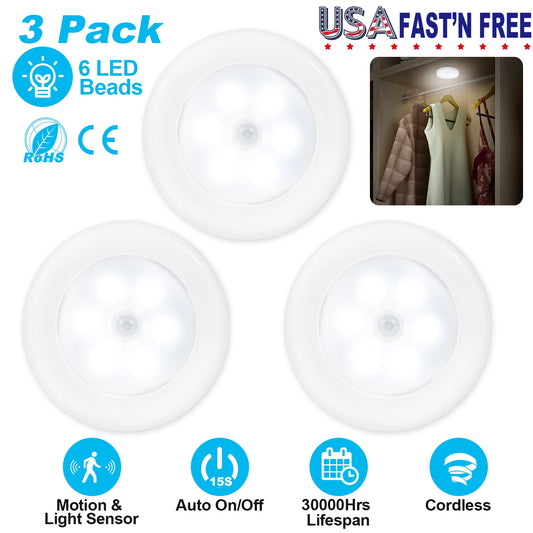3Pcs Motion Sensor Light Closet Lights Magnetic Stick-on Cordless Night LED Lamp Battery-Powered for Stair Hallway Cabinet Camping