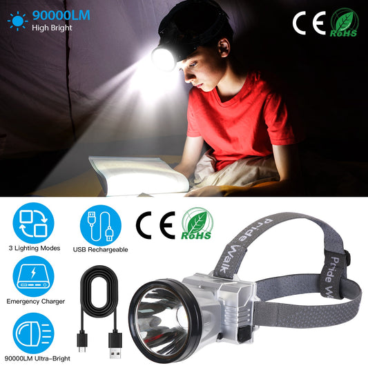 Rechargeable Headlamp High Power Headlight Torch Flashlight with 3 Light Modes for Fishing Running Camping Hiking