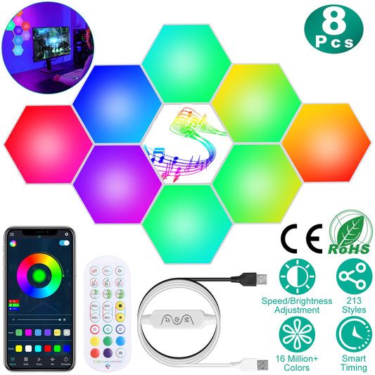 8Pcs Hexagon Light Panels RGBW Colorful Splicing Wall Lamps App Remote Line Control Timing Decorative Gaming Light Music Sync Lamps