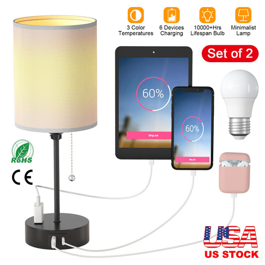 2Pcs Beside Lamps for Bedroom 3 Color Modes Nightstand Lamp USB C+A AC Output Ports Pull Chain E26 Bulb Light