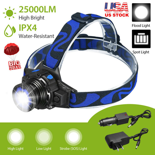 25000 LM Headlamp LED Tactical Headlight Zoomable Flashlight Torch w/Charges Camping