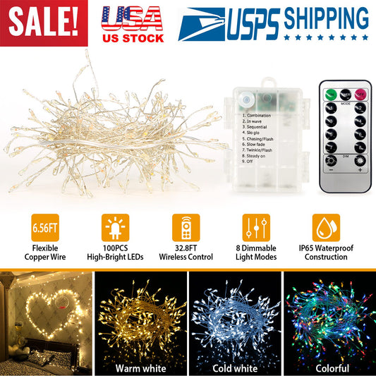 2M 100 LED Fairy String Lights Copper Wire w/Remote Control Party Xmas Decore Lights