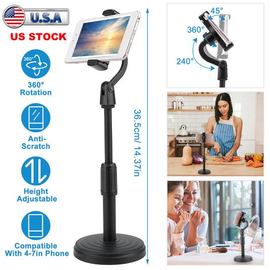 Desktop Phone Stand Angle Height Adjustable Phone Clamp Mount Rotatable Cell Phone Holder For 4-7in Device Selfie Vlog Recording Streaming