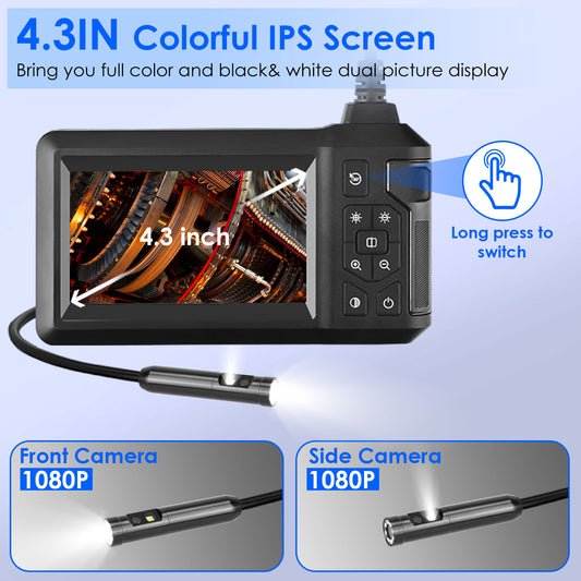 1080P Dual Lens Endoscope Camera with 8 LED Light 8mm Borescope Inspection Camera 4.3Ó Colorful Screen IP67 Waterproof 16.4FT Semi-Rigid Cord Handheld