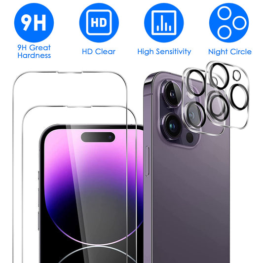 2Pcs HD Clear Screen Protectors 2Pcs Camera Len Protectors Tempered Glass Film Full Coverage Screen Protector Set Fit for IOS Phone 14/14Plus/14Pro/14