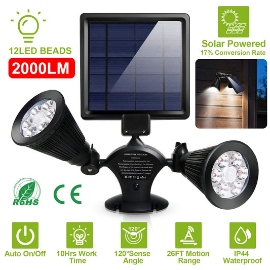 Solar Lights Outdoor Solar Power Motion Sensor Spotlights 2000lm Security Lights w/ Dual Head 360¡ Rotatable IP44 Wall Lights Garden Garage Driveway