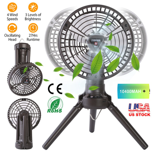 10400mah Portable Camping Fan with LED Light Rechargeable Tripod Tent Hanging Fan Lantern Portable Foldable Oscillating Table Fan with 3 Brightness 4