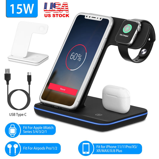 Wireless Charger 3 in 1 Charger Stand 15W Fast Charging Station Dock for iWatch Series 5/4/3/2/1 AirPods iPhone 11/11 Pro/Xs/X Max/XR/X/8/8Plus Samsun
