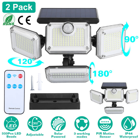 2 Pack Solar Powered Wall Lights IP44 Waterproof Motion Sensor Lights with 4 Adjustable Heads 333Pcs LED Beads 120¡ Sensing Angle Remote Control for Y