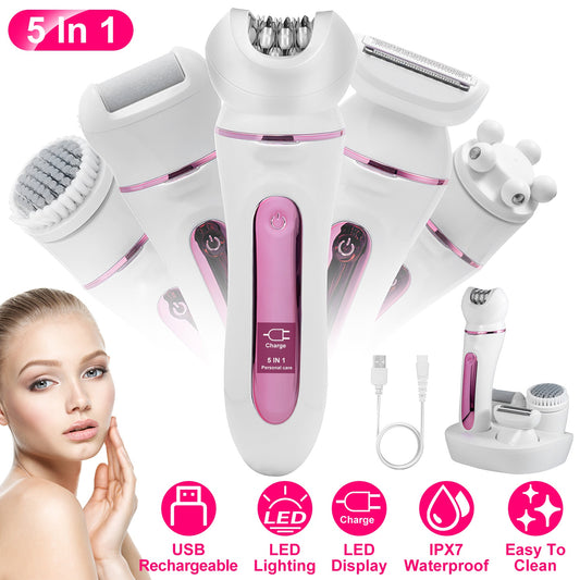 5 In 1 Electric Body Epilator Rechargeable Women\'s Grooming Kit Epilator Shaver Facial Brush Callus Remover 5-Point Massager with LED Light LED Displ