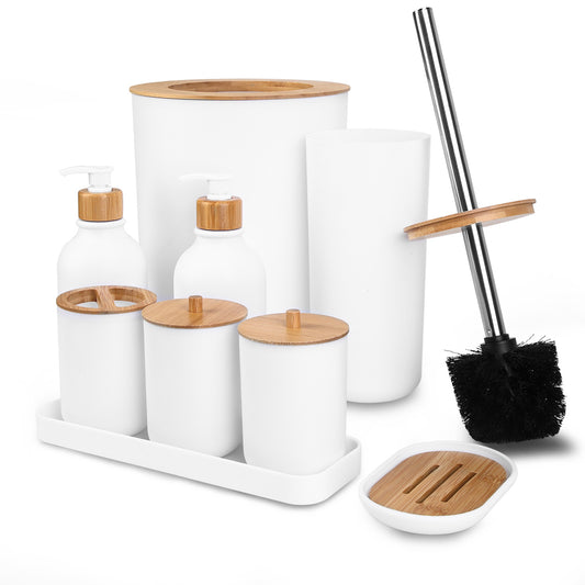 9Pcs Bathroom Accessories Set Trash Can Lotion Soap Dispensers Q-tip Holders Toothbrush Holder Soap Dish Vanity Tray Toilet Brush Black White