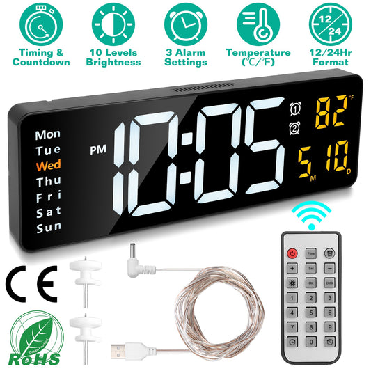 15.7in LED Digital Wall Clock with Remote Control 10 Level Brightness 3 Alarm Settings 12/24Hr Format Timing Countdown Temperature Calendar Display De
