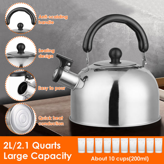 2.1Quarts Stainless Steel Whistling Tea Kettle Stovetop Induction Gas Teapot with Insulated Handle Camping Kitchen Office