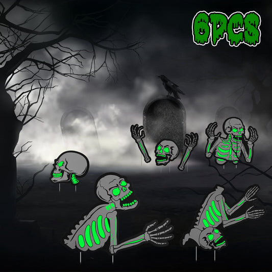 Halloween Skeleton Yard Sign Decorations 6Pcs Glow in the Dark Halloween Skull Fluorescence Lawn Garden Sign with 12 Stakes for Haunted House Garden Y