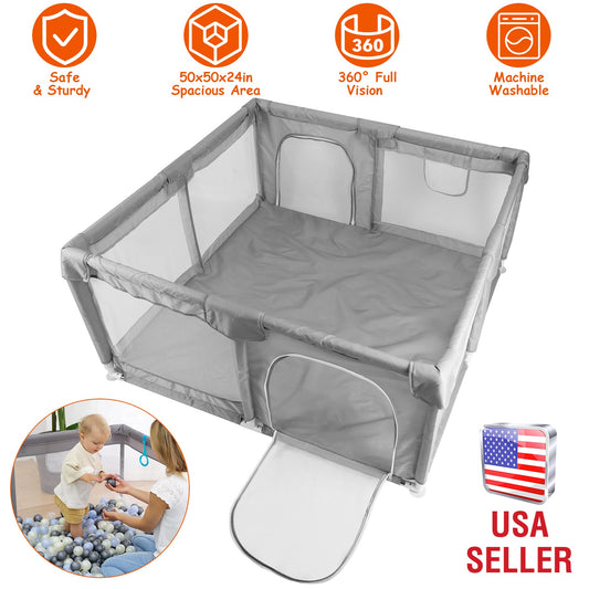 Baby Play Yard 50x50x24in Infant Play Game Child Fence Play Yards Breathable Kids Activity Center with Anti-Slip Suction Base 2 Zipper Doors for Infan