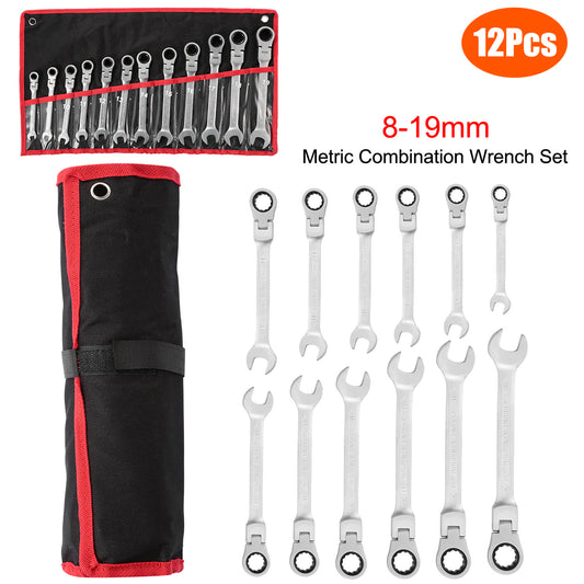 12Pc 8-19mm Metric Combination Wrench Flexible Head Ratchet Wrench Set Spanner Tool Set