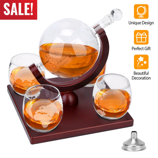 Whiskey Decanter Globe Set w/ 4Pcs 8.45OZ Etched World Whiskey Glasses Wooden Tray Perfect Gift Set for Liquor Scotch Bourbon Vodka