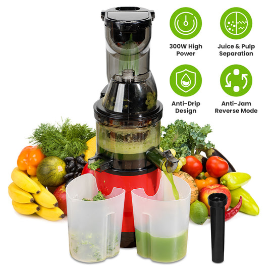 Cold Press Juicer Machine 300W Electric Slow Masticating Juicer for Whole Vegetable and Fruit with Reverse Function 2 Containers Cleaning Brush Clear
