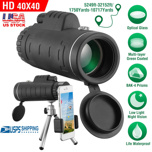 40x40 HD Optical Monocular Telescope w/ FMC Lens Low Light Vision Scope Phone Holder Tripod Compass For Bird Watching Hunting Camping Hiking Sport Eve