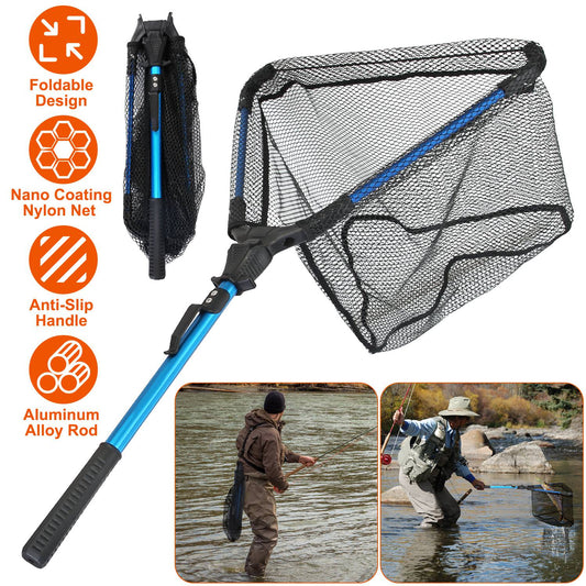 Foldable Fishing Net With Aluminum Alloy Rod EVA Handle Durable 5MM Hexagonal Nano Coating Nylon Mesh Collapsible Landing Net Safe Fish Catching or Re