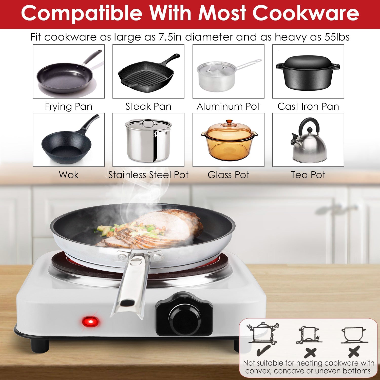 Works with any flat-bottom cookware ≤7.5 inches in diameter — including aluminum, stainless steel, iron, copper, ceramic, or glass pots and pans. (Note: ceramic heats slowly.) -