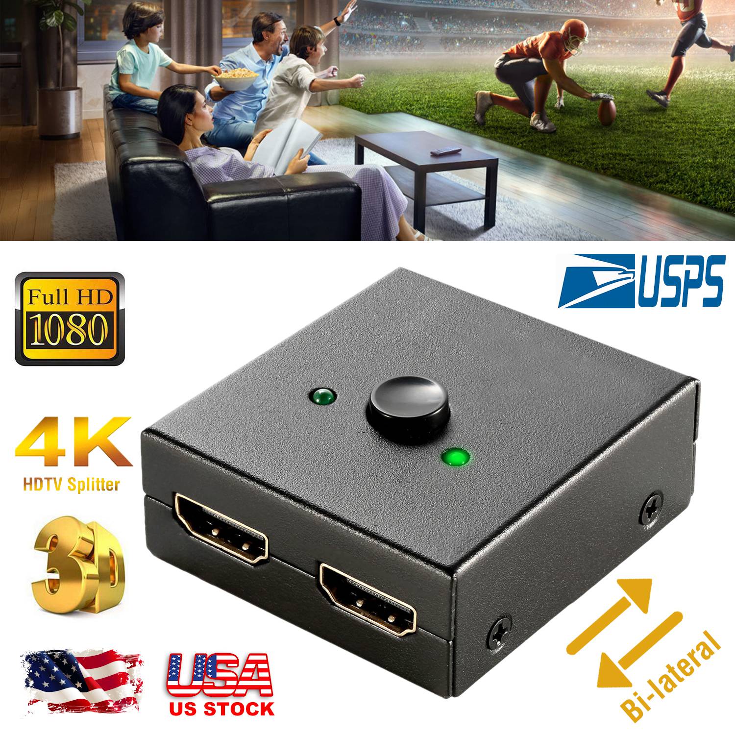 Our 4K HDTV splitter is equipped with 3 HD ports (the one side of the splitter has one HDTV port, the other side has two HDTV ports),a switch button and 2 indicator lights, which features bidirectional work. It can easily connect 2 input sources to 1 HDTV output display and you can switch the input sources via the included switch button, also can connect 1 HD input source to toggle between 2 displays and you can switch the output sources via the switch button. (Note:2 TVs CANNOT display simultaneously).Seamlessly synchronization of audio and video signal with 6m/16.96ft maximum connecting range, shows a HD screen and offering vivid movies or videos. Easy operation and upgraded materials enable it to be widely used for TV Box/ DVD/Desktop PC/Projectors/HDTV etc.. Widely used in video conference, home theater, games etc..