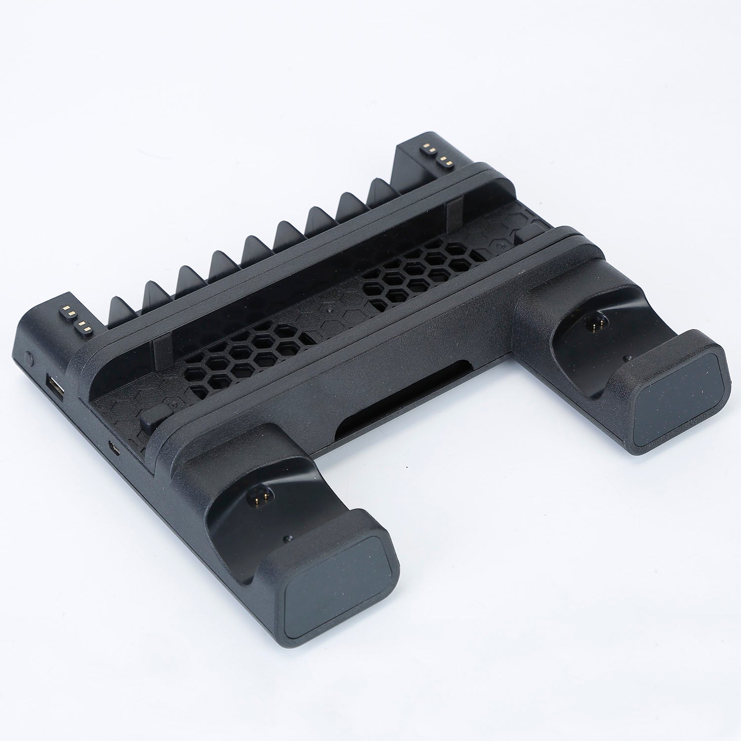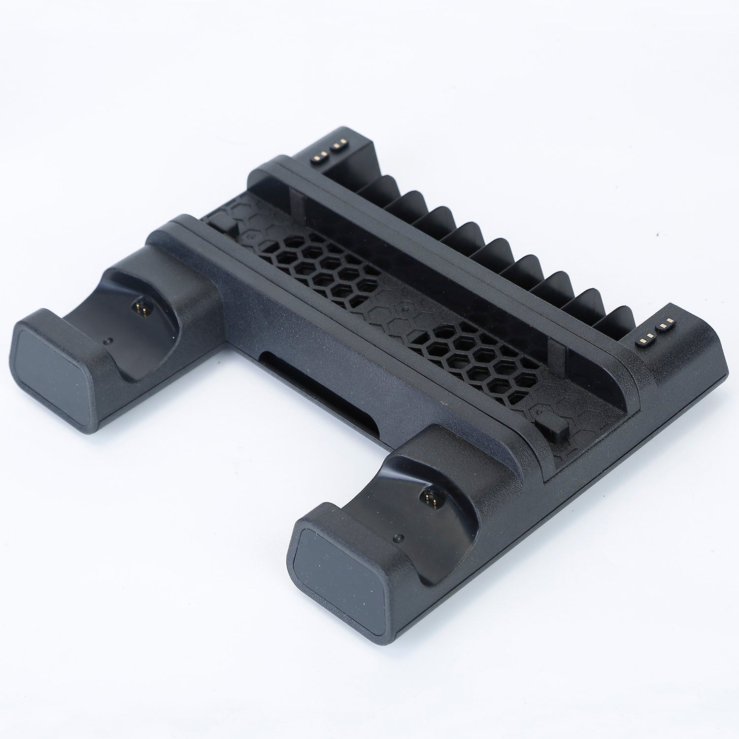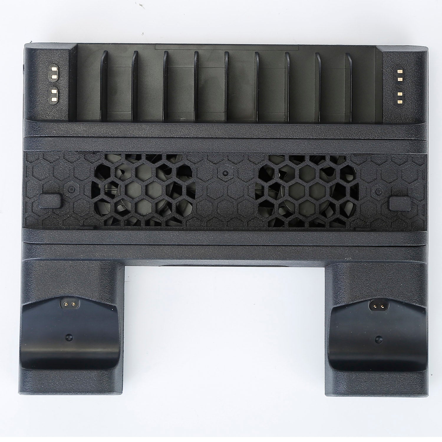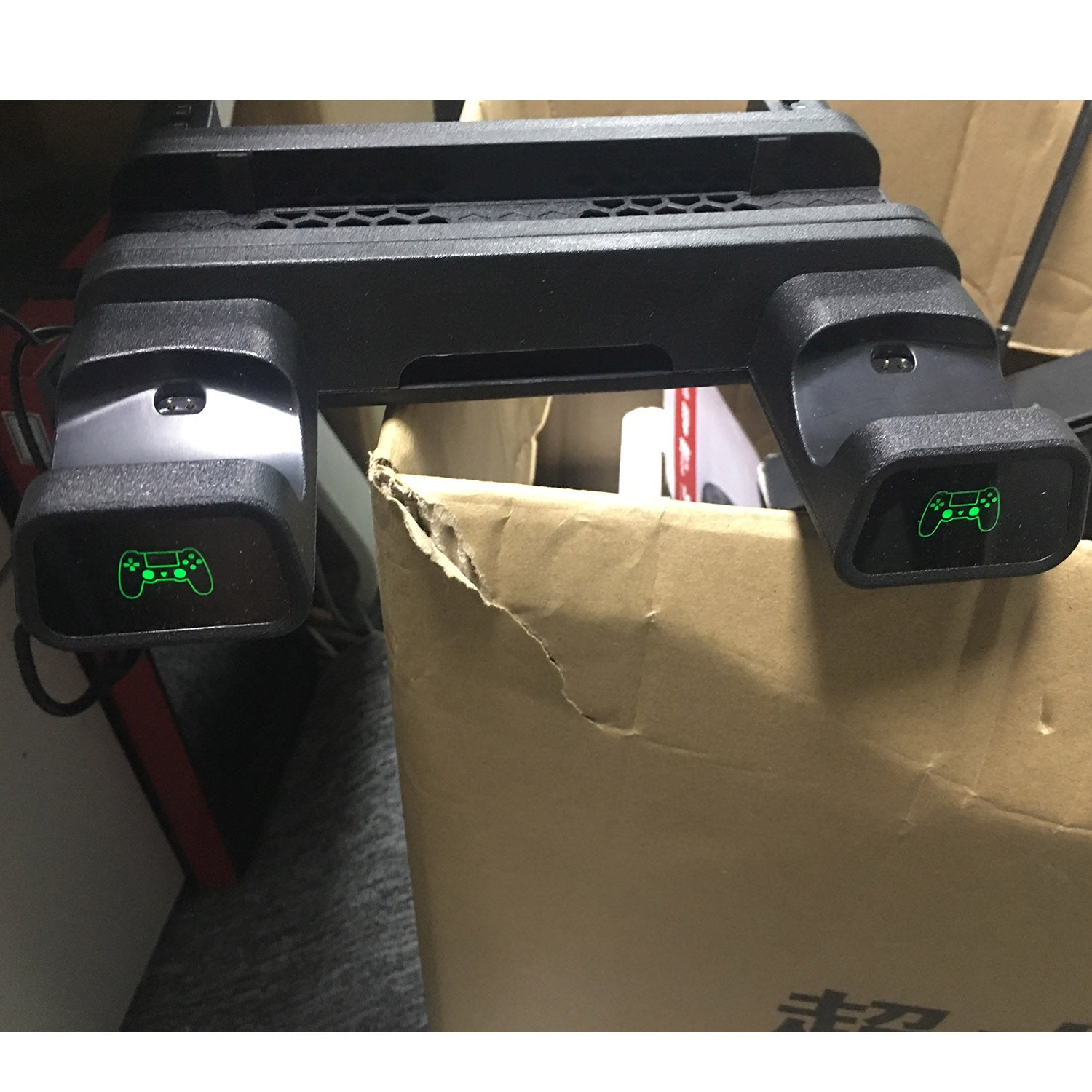 This vertical stand cooler fits for Play Station 4, PS4 Slim and PS4 Pro console, can charge dual controllers at the same time and organize 10 game discs, also 1 USB hub can power other devices. It is easy to set up all your accessories and make full use of vertical space. Dual high speed mute cooling fans convey more air and cool down console, thus prevent your console from over-heating, keeping cooling during and after game time all the day and night. Built-in protector chip, wireless controller charger protects your controller from over voltage/over current or charging long time. Sleek and ultra-lightweight provide great portability.
