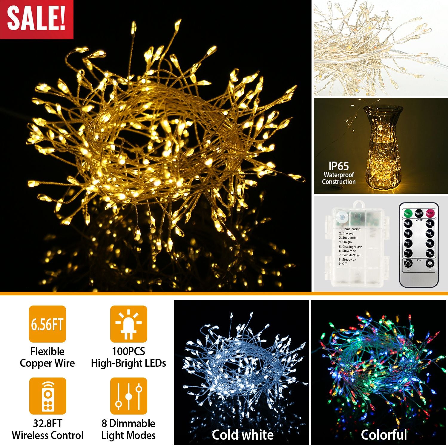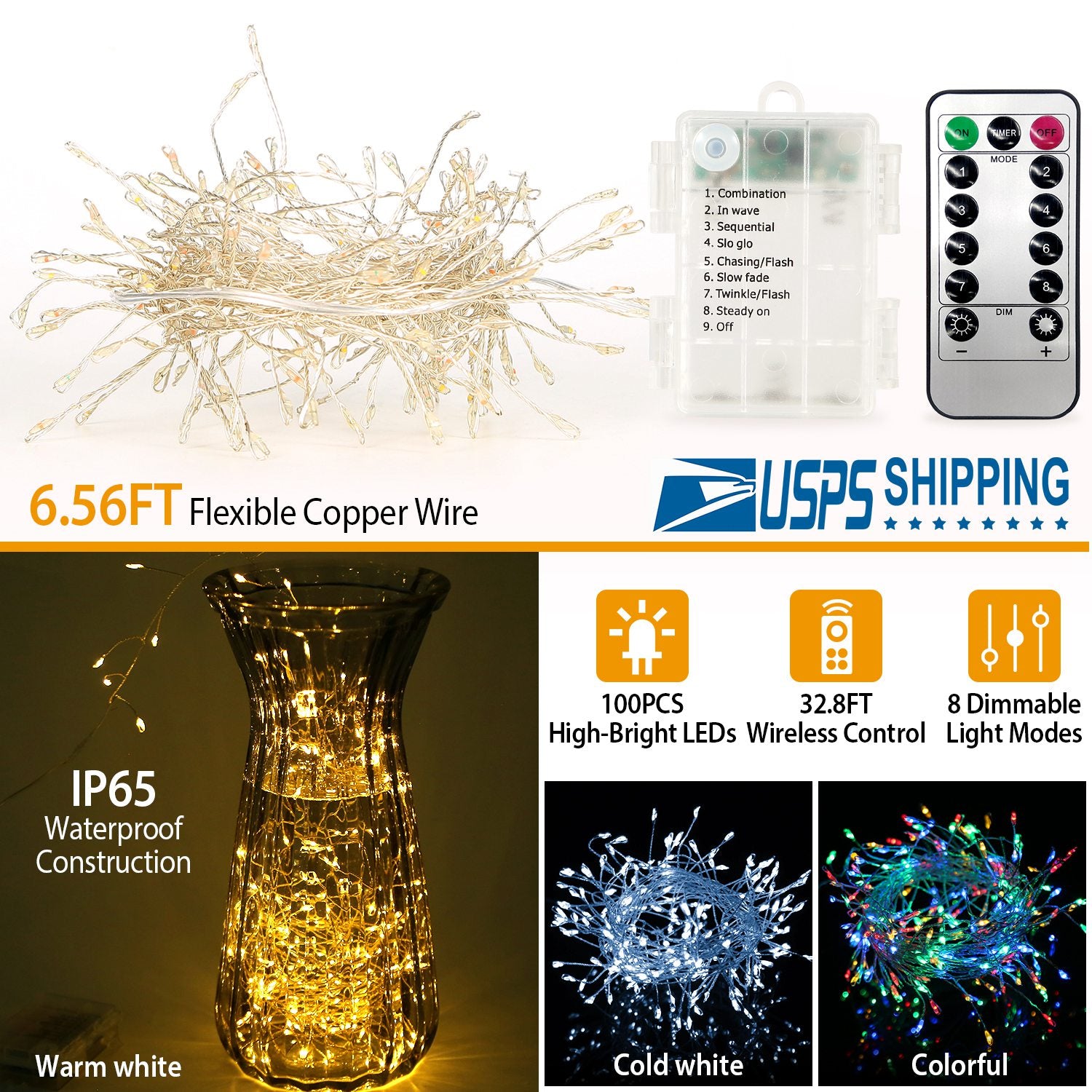 Our light string featuring 100pcs high-bright, low heat and low power consumption LEDs, 8 dimmable light modes and 6.56ft easy-to-shape copper wires can be can be flexibly wrapped on fences, handrails, lawn, trunks or gazebos to create a fairyland and cheerful atmosphere for modern wedding, showcase, cafŽ, parties (birthdays, holiday, anniversaries, festivals, etc.), courtyard, patios, pergolas, porches, rooms, etc. Additionally, you can wireless control the light strings such as light modes within 10m/32.8ft with the coming remote control, and when you use it outdoors, you do not have to worry about rain and snow, due to its IP65 waterproof performance.