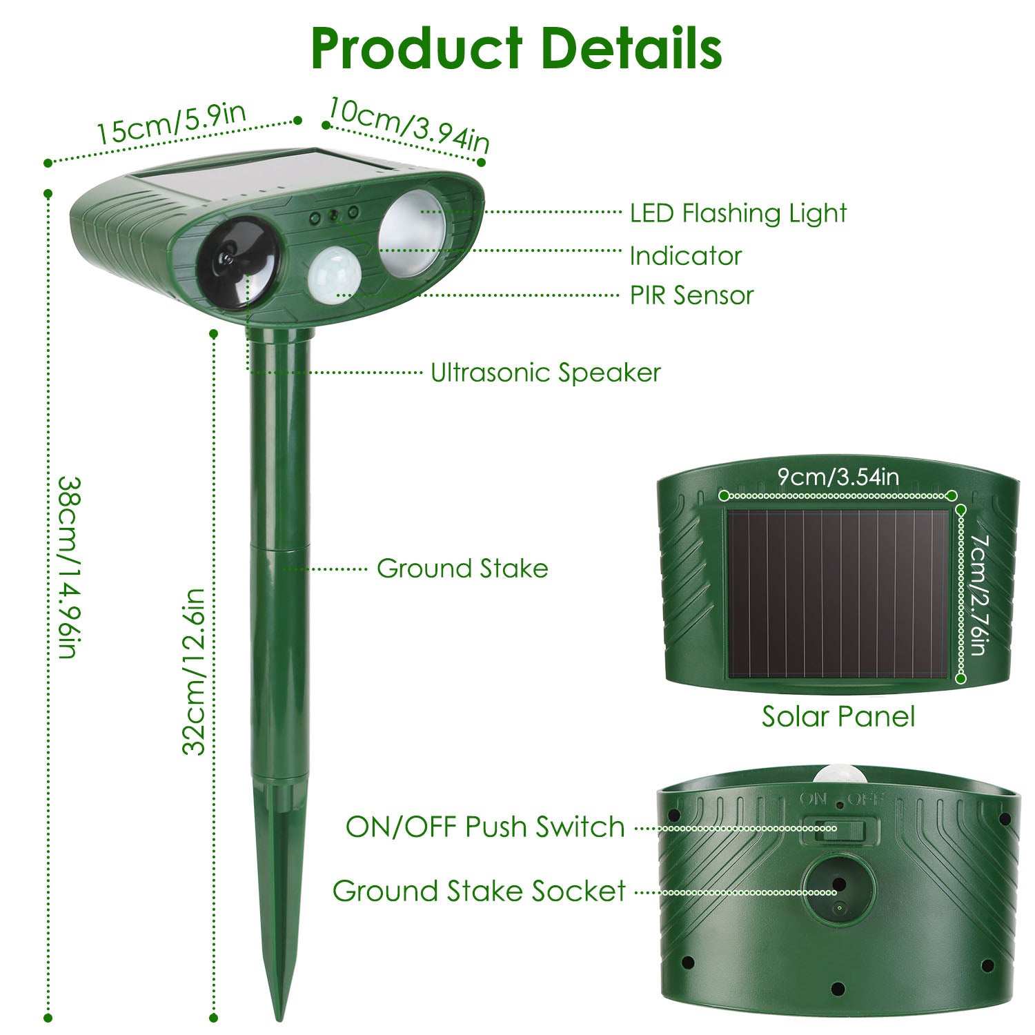 Solar Ultrasonic Animal Repeller PIR Sensor Animal Repellent Chaser with Flashing Light IPX4 Waterproof for Chasing Deer Raccoon Squirrel Rat Skunk Ra