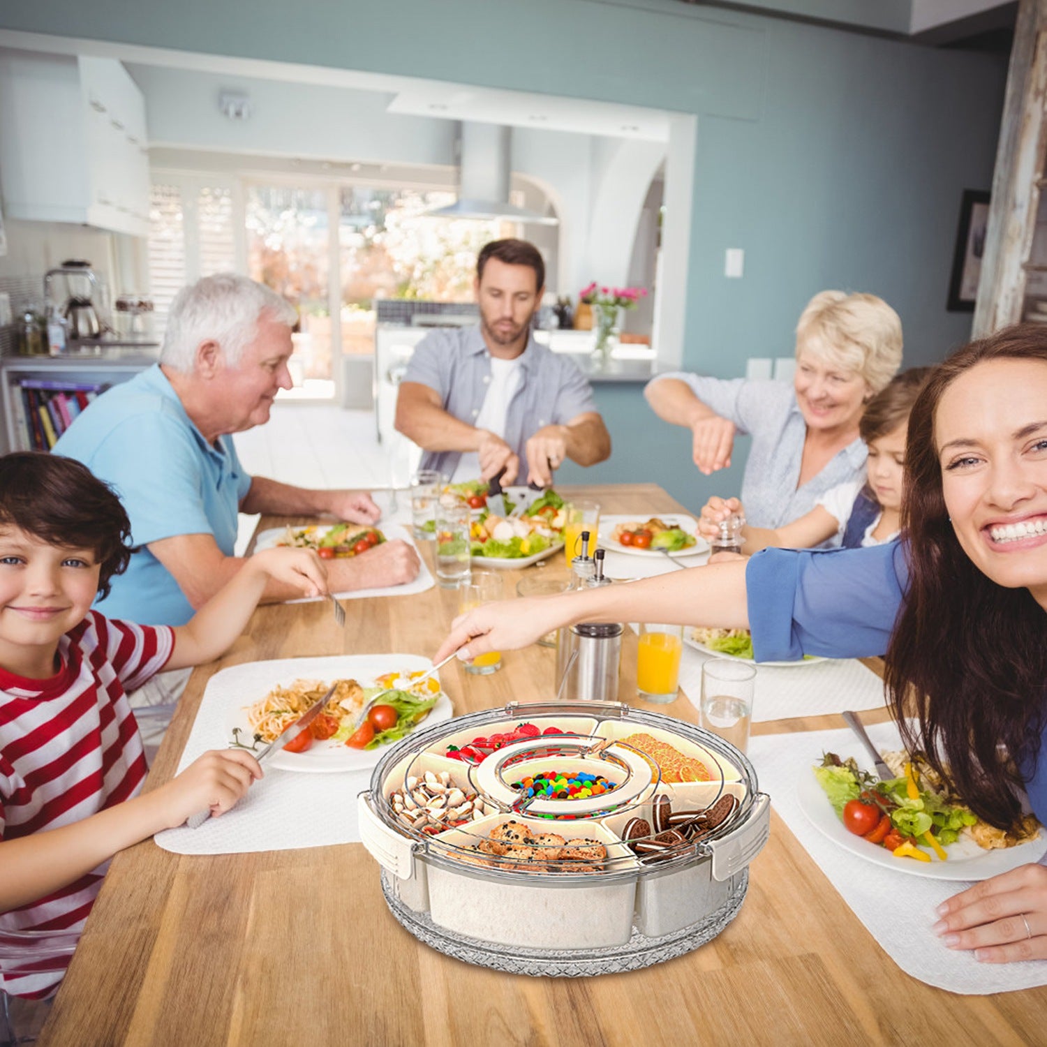 Perfect for storing snacks, fruits, nuts, candies, and even salads, our divided serving tray is designed to keep your snacks and fruits neatly sorted while preventing any unwanted mixing of flavors. Sealed lid with silicone circle and secure latches helps maintain freshness and cleanliness of food. And hidden handle ensures convenient portability wherever you go. 360¡ rotatable base makes serving yourself and your guests much easier than ever before. Whether you\'re camping, hosting a party, enjoying a picnic, or having a family movie night, our divided snack box containers is your best choice!