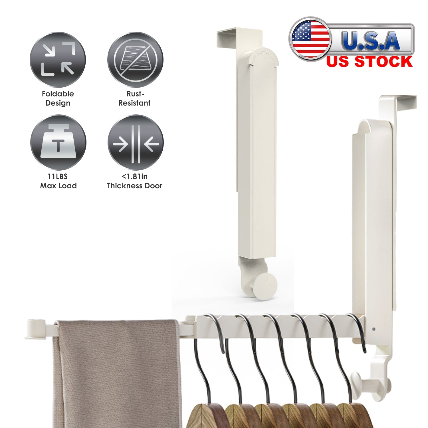 Our over-the-door clothing hanger hook features a 6-groove design for versatile hanging, offering ample space without tools or installationÑjust place it on any standard door under 1.81in thickness. Made of rust-resistant aluminum alloy, it supports up to 11lbs, ensuring durability without bending or cracking. Its foldable design adjusts from 9.64in to 13.38in, making it compact for travel. Ideal for bathrooms, bedrooms, laundry rooms, hotels, and more, it helps organize clutter effortlessly. A sturdy, space-saving solution for home or travel.