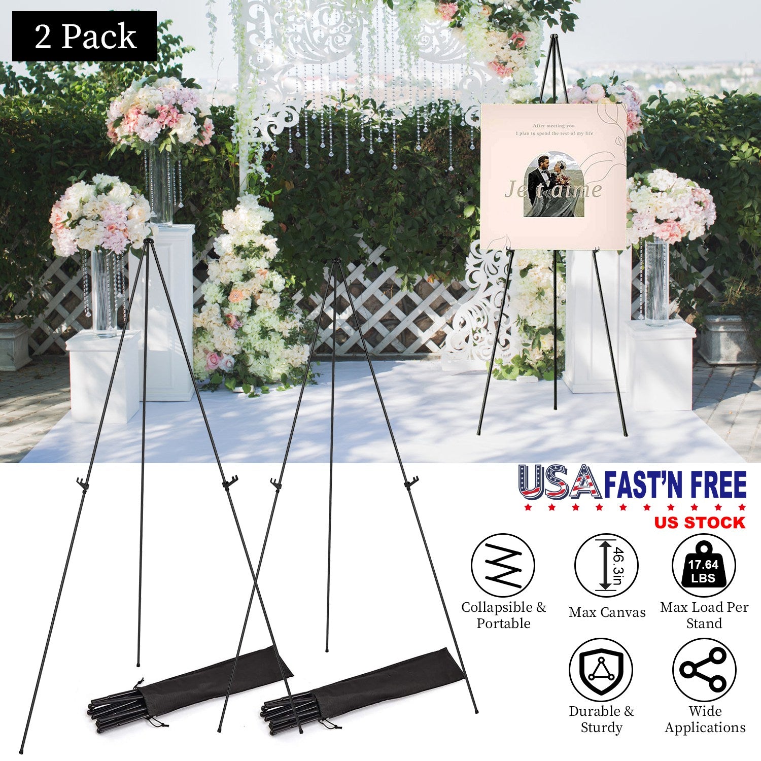 2 Pack Easel Stand for Display 61in Collapsible A Frame Tripod Easel Iron Alloy Drawing Stand with 2 Carry Bags for Wedding Poster Art Drawing Meeting