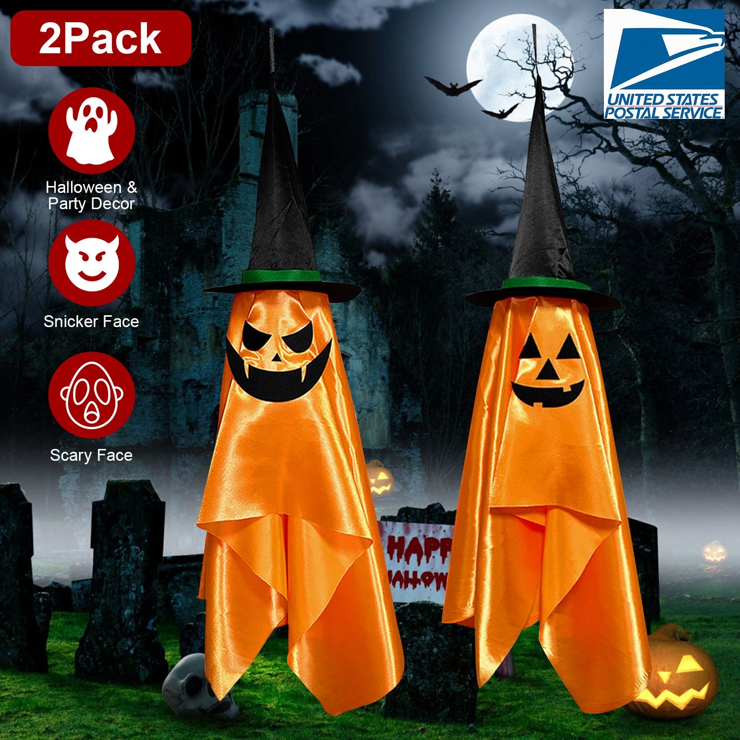 2 Pack Hanging Ghosts with Wizard Hat Snicker Scary Face Halloween Party Hanging Decorations Pumpkin Wizard Hat for Eave Tree Porch