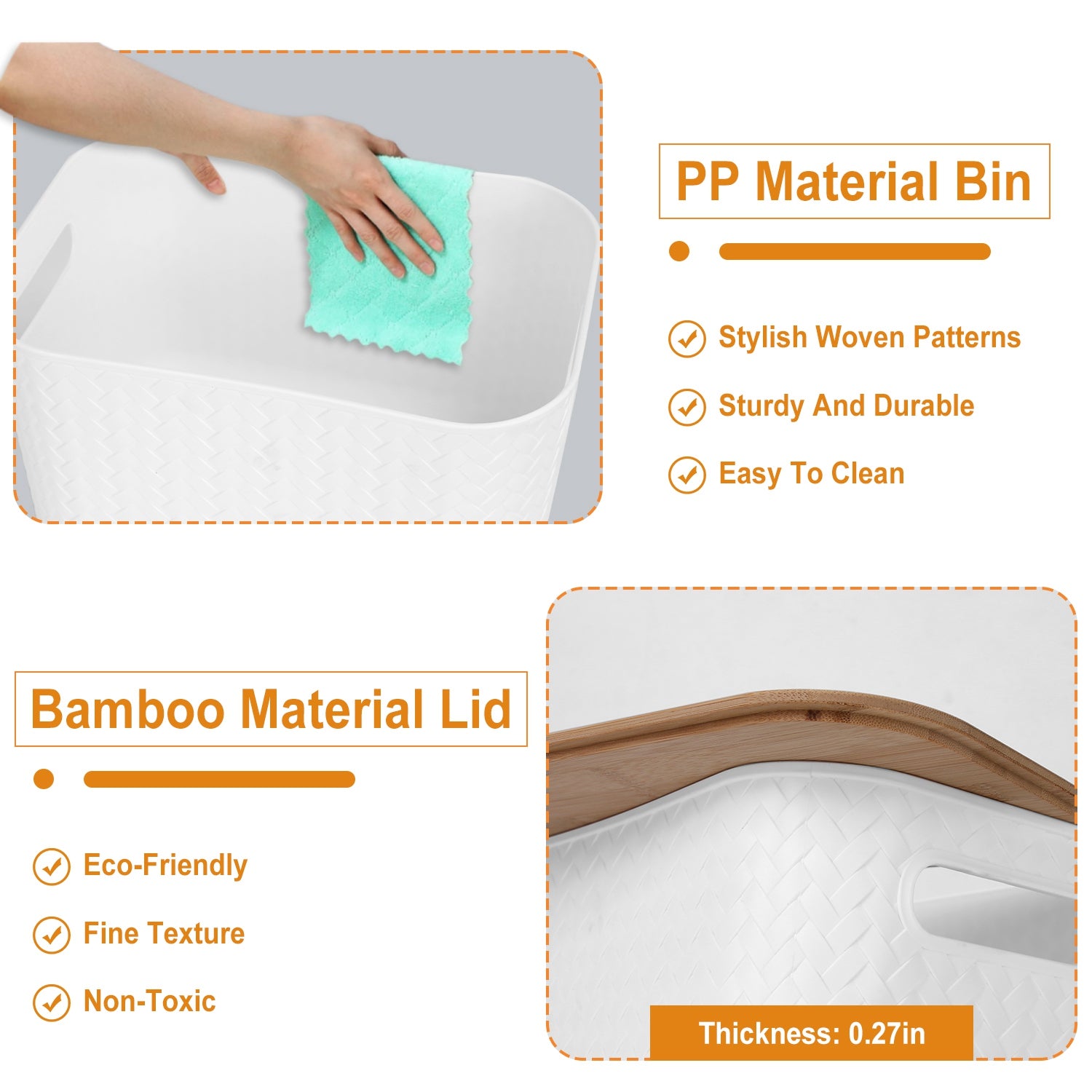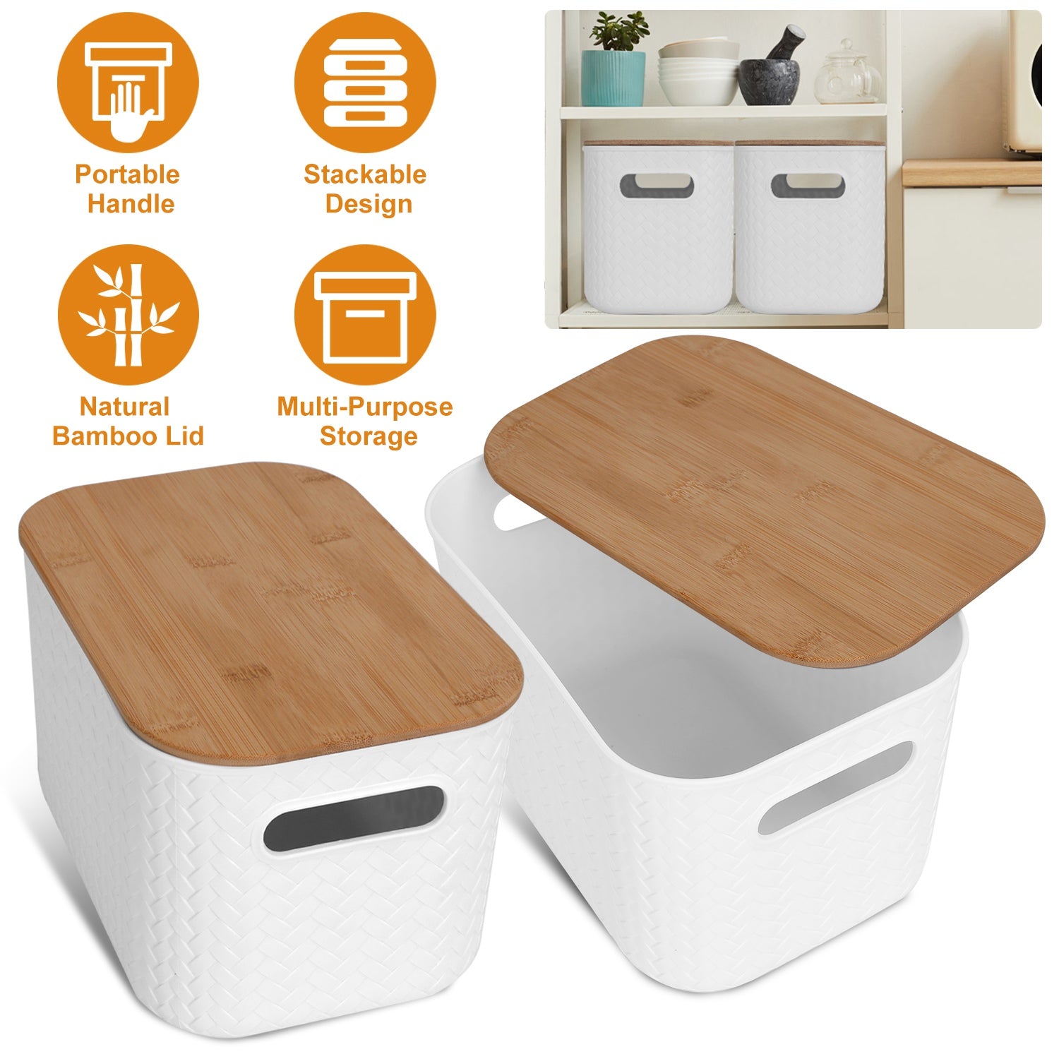 2Pcs Storage Bins with Bamboo Lids Stackable Plastic Storage Container with Handle Storage Box Accessories Holder for Bedroom Kitchen Shelf Closet