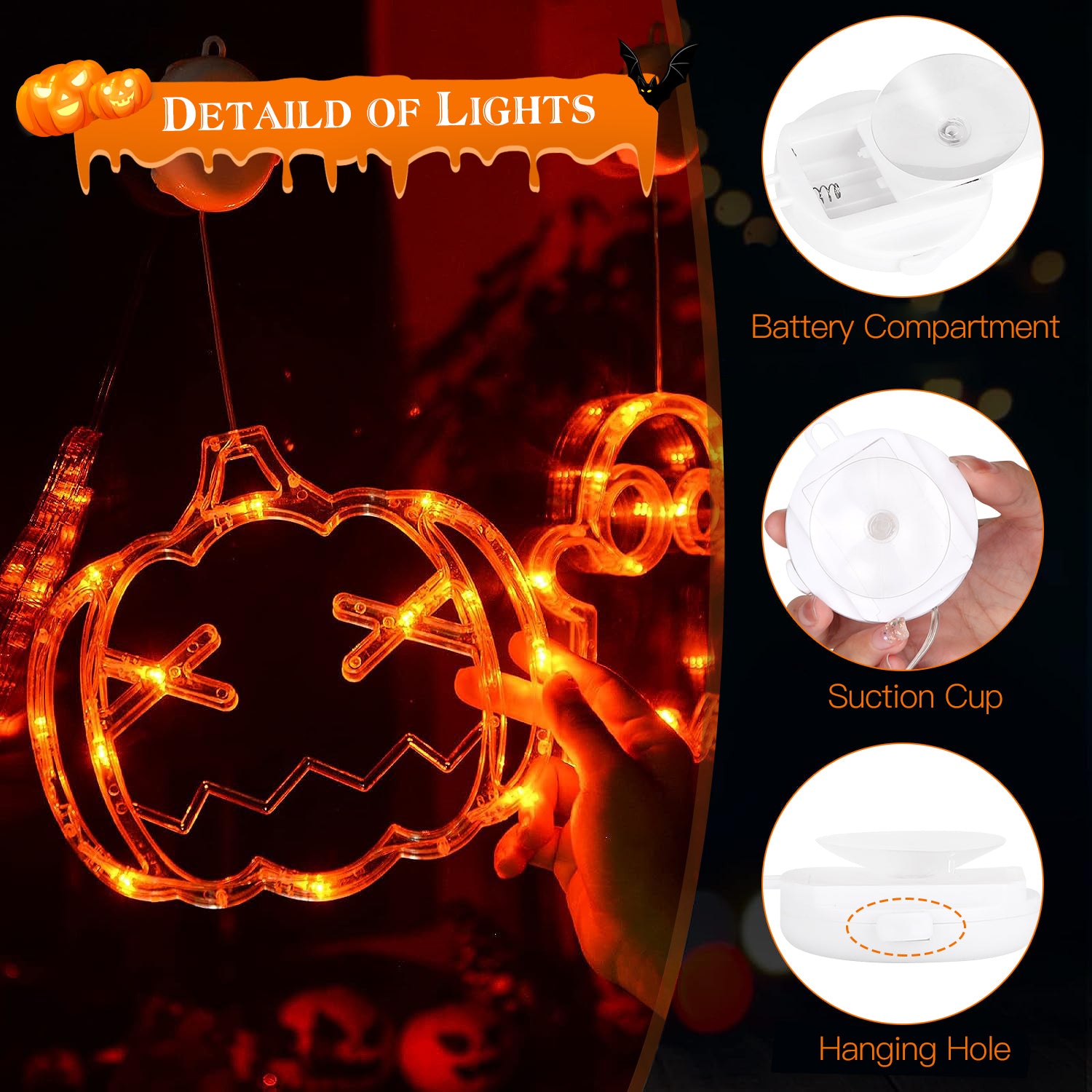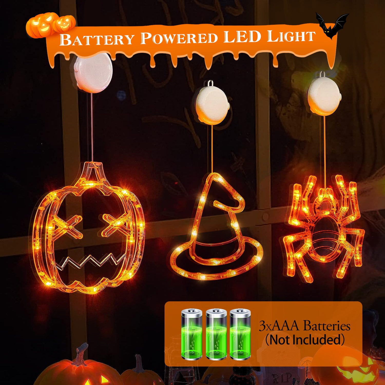 Want to become the most attractive house in this Halloween? Our 3 pack of LED light with the shape of pumpkin, witch hat and spider, can glow warm orange light to add creepy atmosphere. Battery compartment is combined with suction cup and hanging hole, one-piece design is more convenient for you. You can use them to decorate living room, bedroom, front door, window and so on. Perfect choice for this Halloween indoor and outdoor decoration!