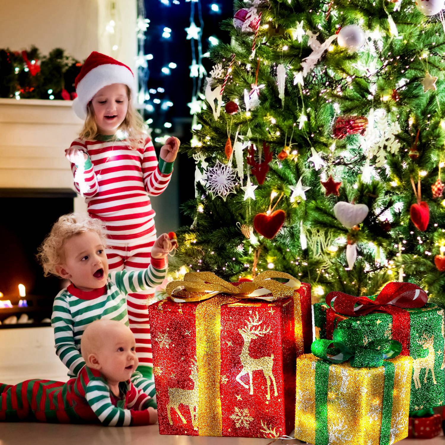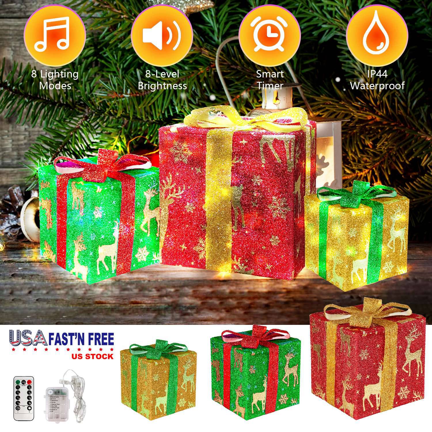 Set of 3 Christmas Lighted Gift Boxes Xmas Present Ornament 50 LED Christmas Box Decorations with Ribbon Bows IP44 Waterproof Battery Powered for Indo