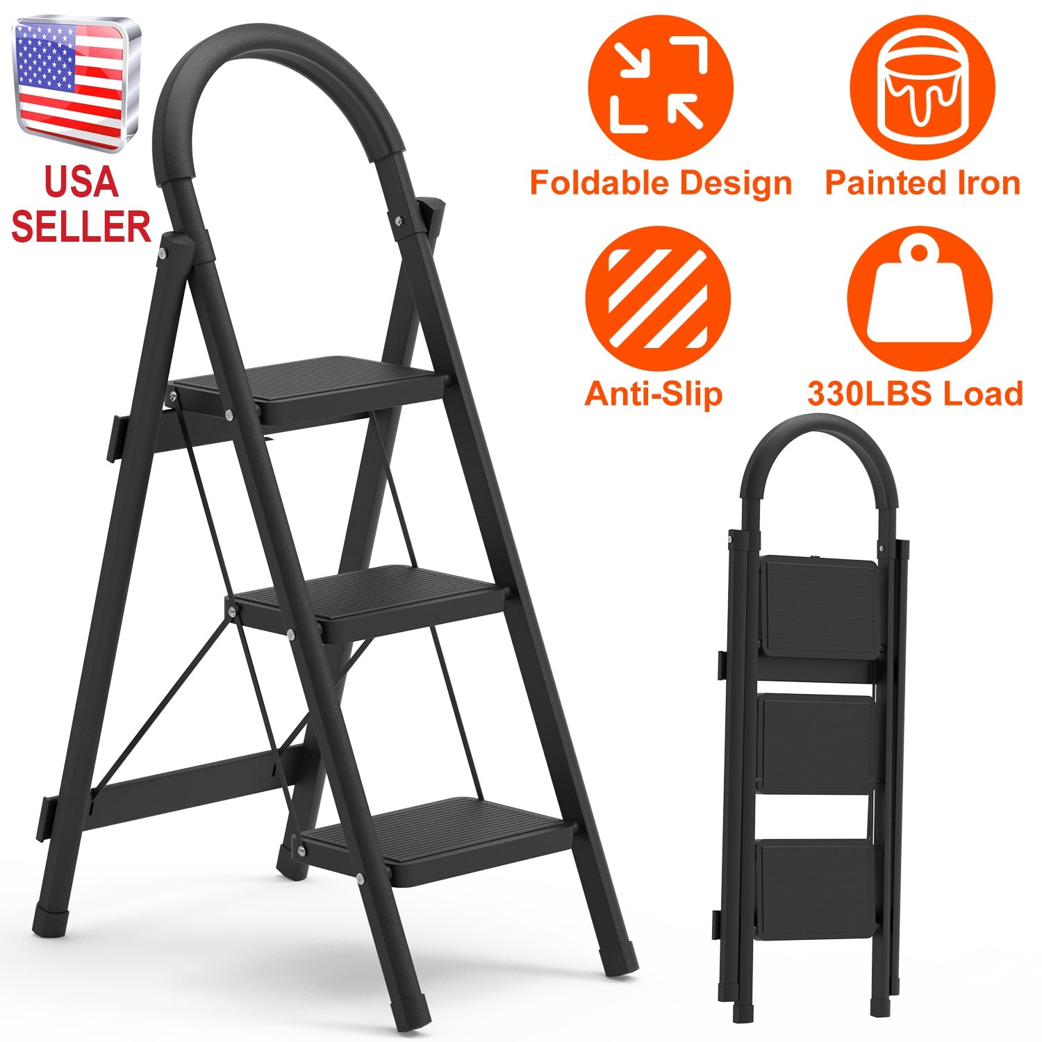 3-Step Foldable Ladder With Wide Anti-Slip Pedal Safety Locking Design Soft Handgrip Portable Lightweight Folding Step Stool 330LBS Load Capacity for