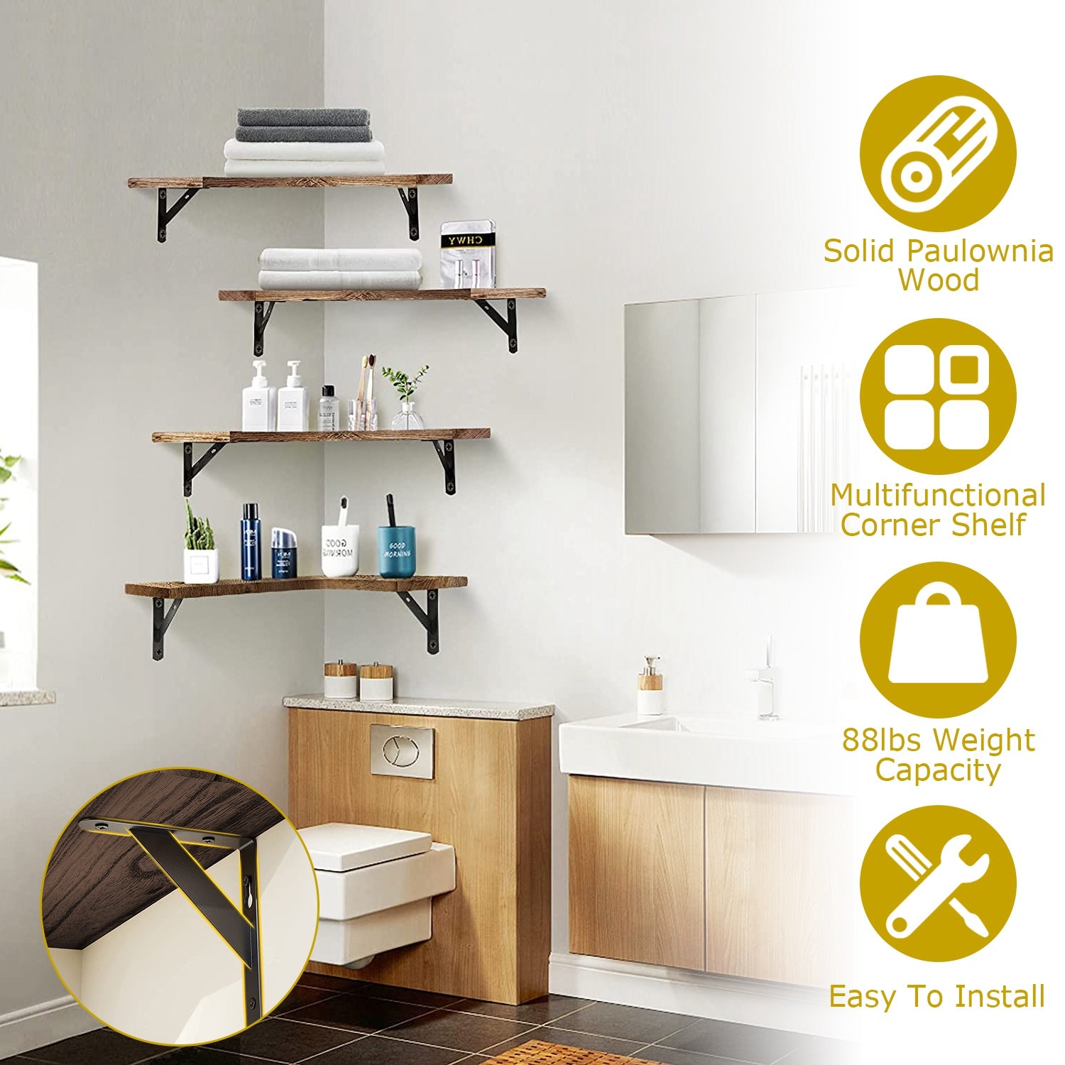 Are you often complaining that the space of your home is too small to contain so many gadgets of yours? Sometimes we cannot change the fact that we have a tiny home with a limited space. However, this corner floating shelf can help you fully utilize the corner space to hold condiments, cosmetics, potted plants, books, and etc.. Moreover, the wooden board also adds a touch of nature and retro style to your home, perfectly blending in with most decoration styles.