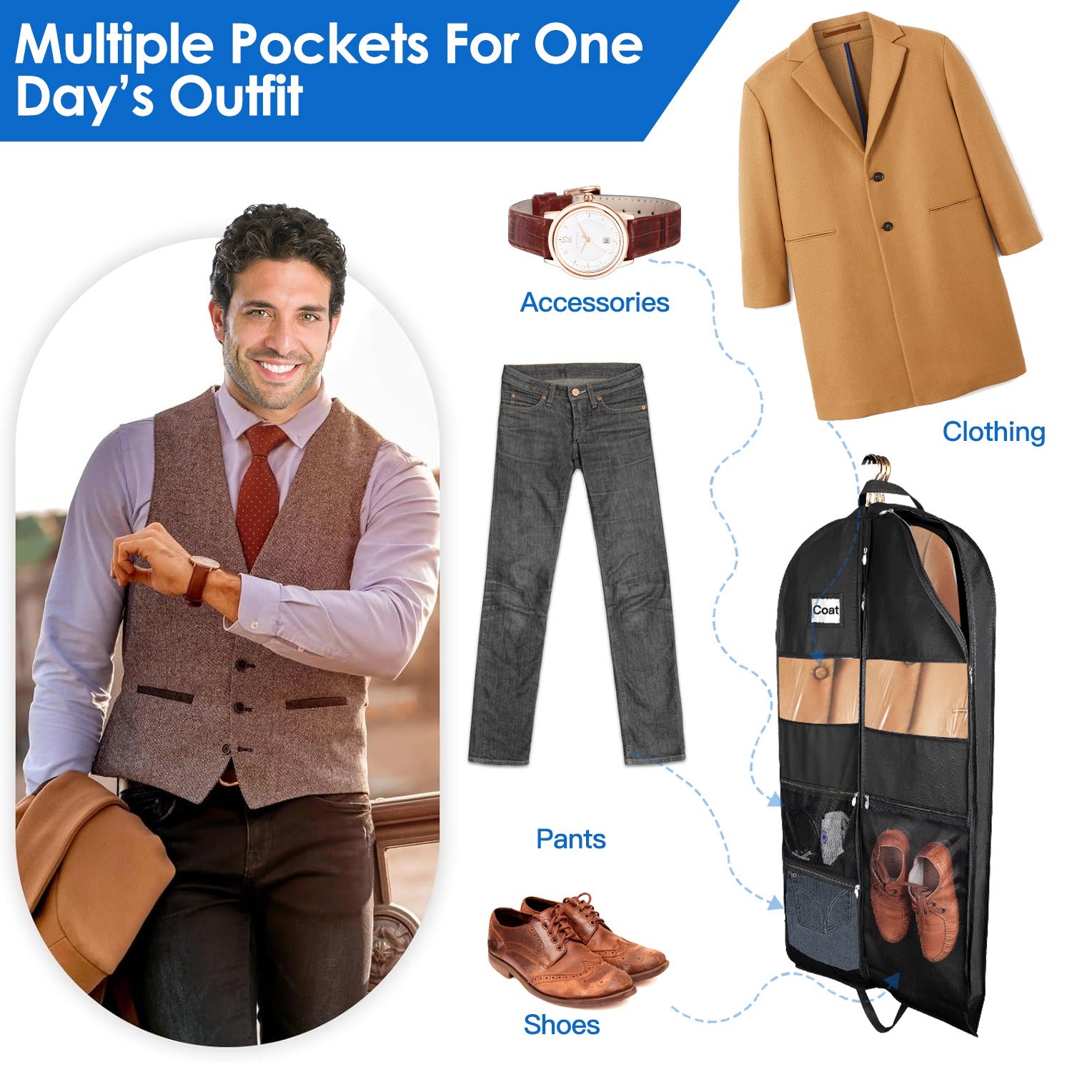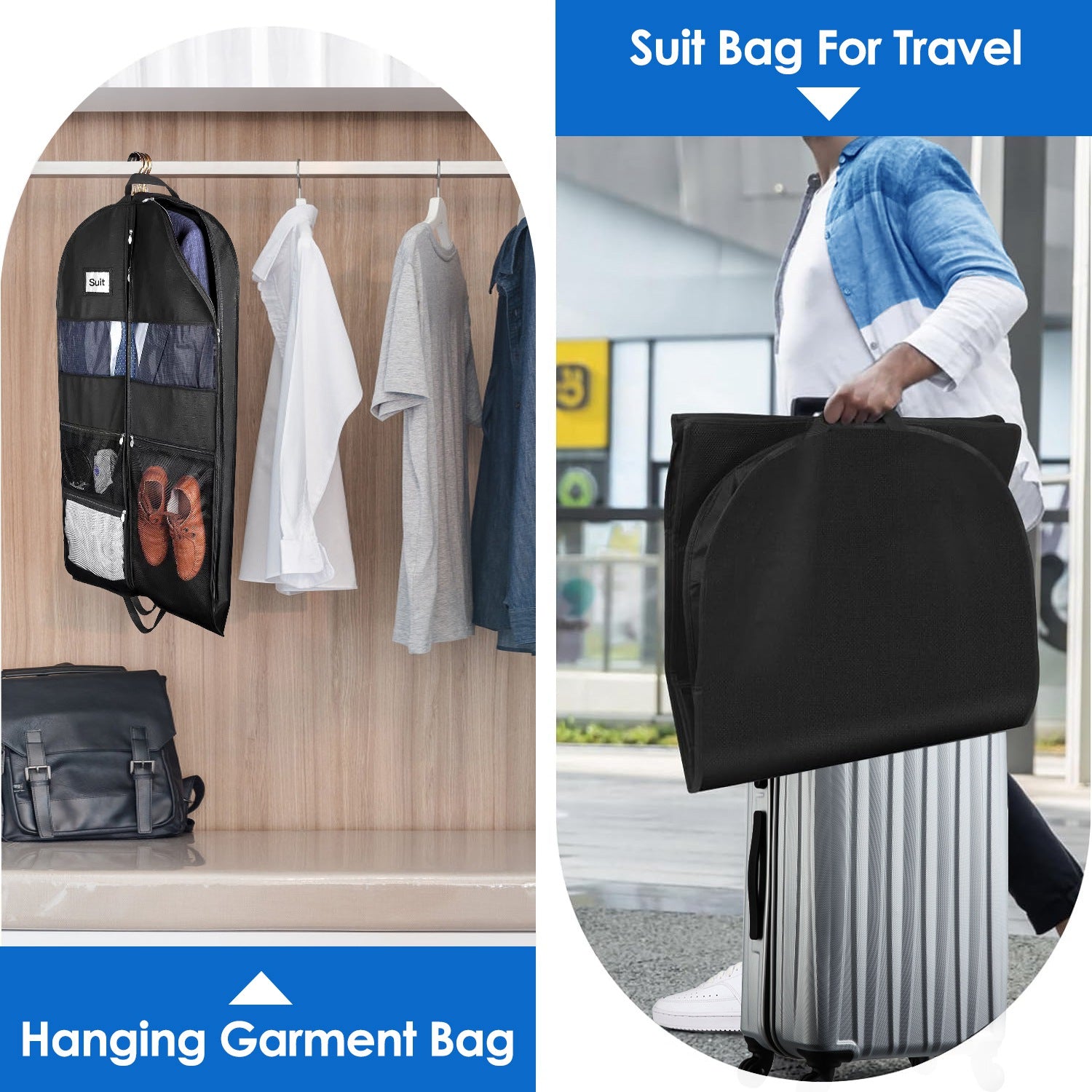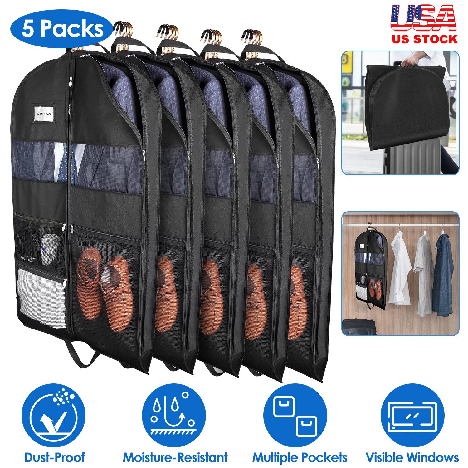 Are you tired of ironing your suit every morning when go out? Our 5 packs hanging storage garment bags are able to keep your suit, coat, shirt, dress and other garment storage in the non-woven bags and protect them from dust, dirt, moisture and wrinkling. You can also hold your other accessories like shoe/tie/hat in the three mesh pockets. Clear card holder and two windows allow you to recognize your different clothing easily. Two strap handles make it easy to carry, great for both home and travel usage.
