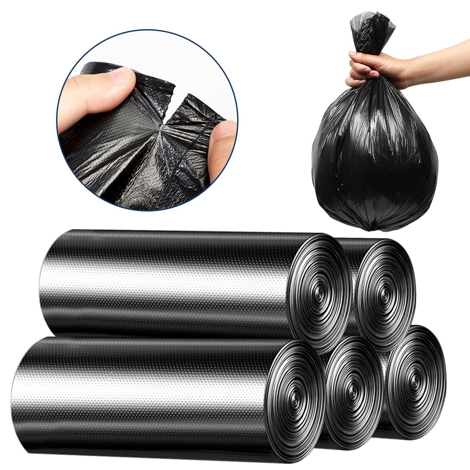 These trash bags include 5 rolls, 50 count in total, fit up to 3.5 gallon size trash can. Made of premium Polyethylene material, strong enough for daily household demands. Unscented and feature black color. Suitable for kitchen, office, bedroom, and bathroom use.
