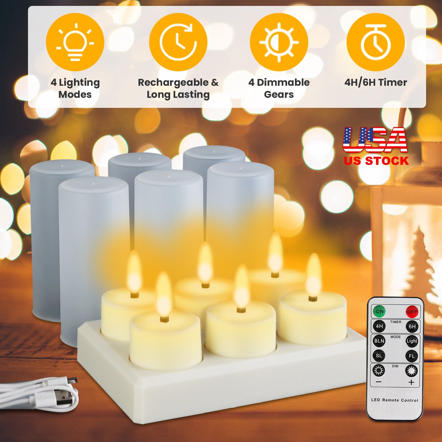 6Pack Rechargeable Tea Lights With Charging Base Flameless Flickering LED Candles with Timer Remote Control for Halloween Christmas Wedding Party